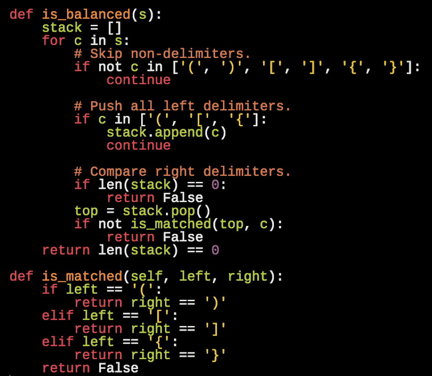 - If it’s a right parenthesis, pop the top element of the stack and compare with the right parenthesis. If they are matched, keep processing the string. Otherwise, delimiters are not balanced.